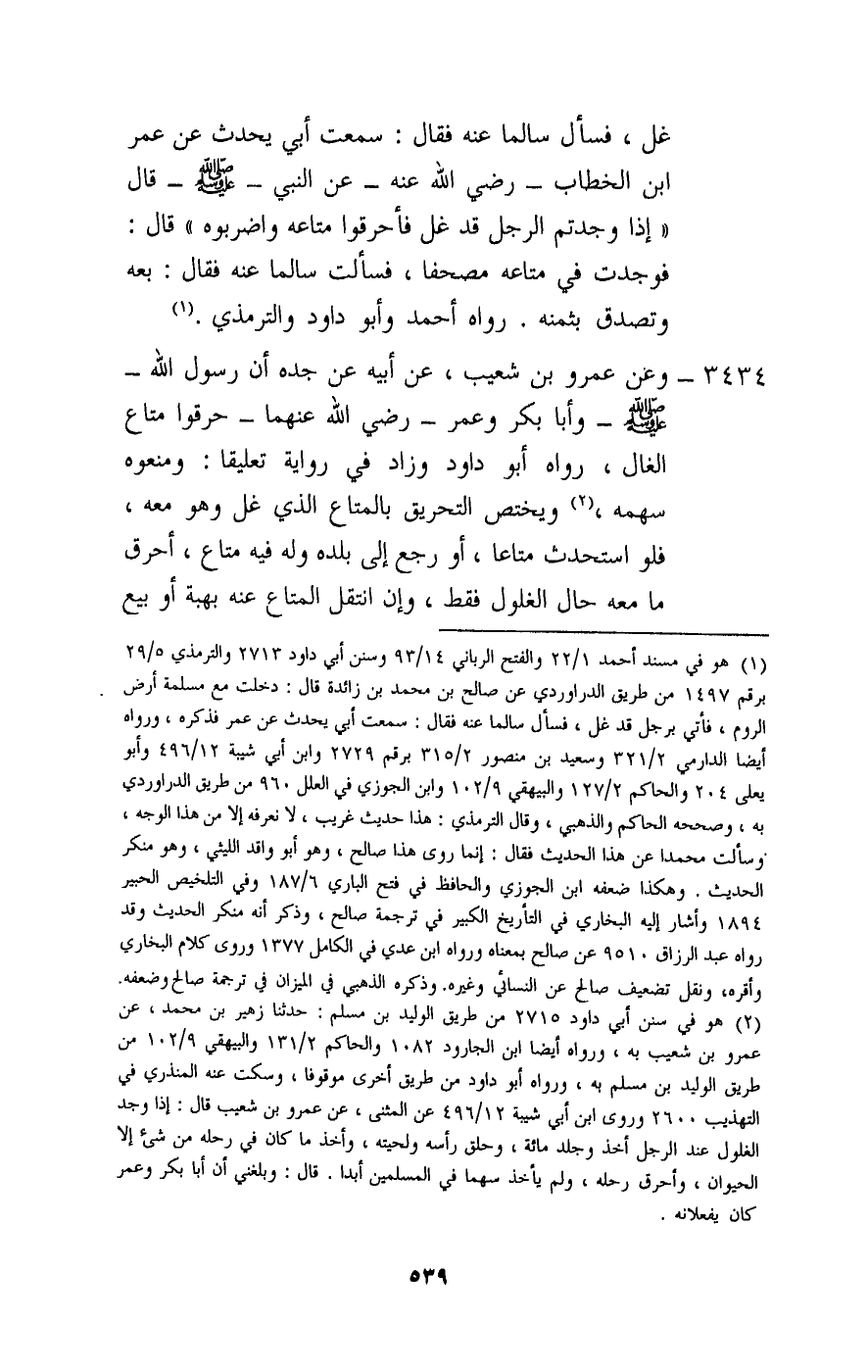 3434 - وعن عمرو بن شعيب، عن أبيه عن جده «أن رسول الله - صَلَّى اللَّهُ عَلَيْهِ وَسَلَّمَ - وأبا بكر وعمر - رَضِيَ اللَّهُ عَنْهُمَا - حرقوا متاع الغال» رواه أبو داود، وزاد في رواية تعليقا: ومنعوه سهمه، ويختص التحريق بالمتاع الذي غل وهو معه، فلو استحدث متاعا، أو رجع إلى بلده وله فيه متاع، أحرق ما معه حال الغلول فقط، وإن انتقل المتاع عنه بهبة أو بيع