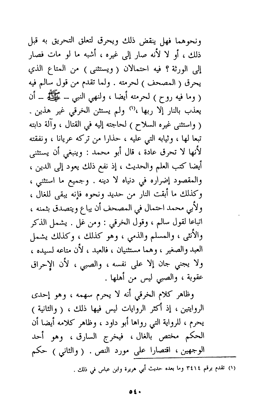 ونحوهما فهل ينقض ذلك ويحرق لتعلق التحريق به قبل ذلك، أو لا، لأنه صار إلى غيره، أشبه ما لو مات فصار إلى الورثة؟ فيه احتمالان، (ويستثنى) من المتاع الذي يحرق (المصحف) لحرمته. ولما تقدم من قول سالم فيه: (وما فيه روح) ، لحرمته أيضا، ولنهي النبي - صَلَّى اللَّهُ عَلَيْهِ وَسَلَّمَ - أن يعذب بالنار إلا ربها، ولم يستثن الخرقي غير هذين. (واستثنى غيره السلاح) لحاجته إليه في القتال، وآلة دابته تبعا لها، وثيابه التي عليه، حذارا من تركه عريانا، ونفقته لأنها لا تحرق عادة.