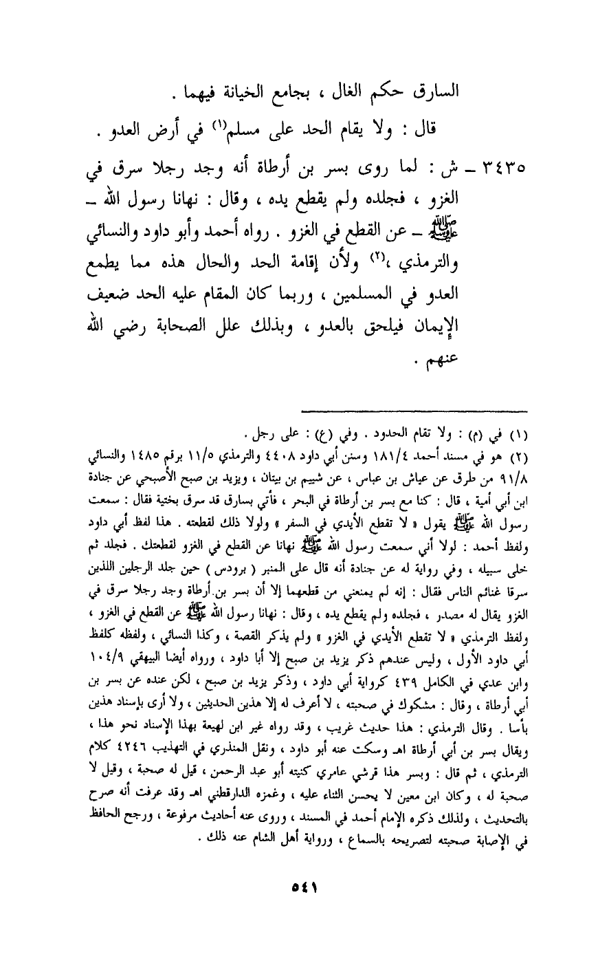 3435 - ش: لما «روى بسر بن أرطاة أنه وجد رجلا سرق في الغزو، فجلده ولم يقطع يده. وقال: نهانا رسول الله - صَلَّى اللَّهُ عَلَيْهِ وَسَلَّمَ - عن القطع في الغزو.» رواه أحمد، وأبو داود، والنسائي، والترمذي؛ ولأن إقامة الحد والحال هذه مما يطمع العدو في المسلمين، وربما كان المقام عليه الحد ضعيف الإيمان فيلحق بالعدو، وبذلك علل الصحابة - رَضِيَ اللَّهُ عَنْهُمْ -.