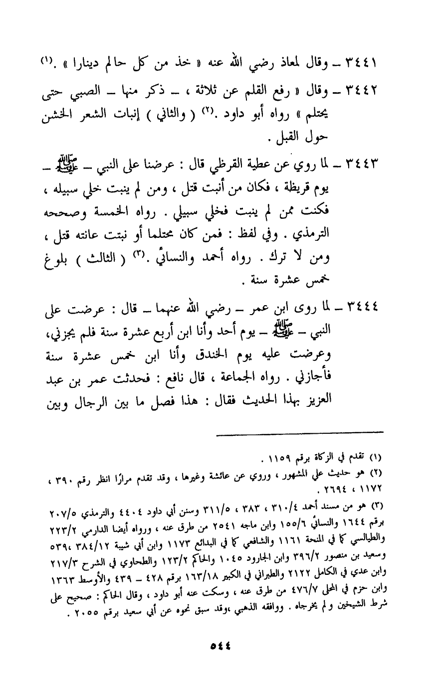 3443 - لما روي عن عطية القرظي قال: «عرضنا على النبي - صَلَّى اللَّهُ عَلَيْهِ وَسَلَّمَ - يوم قريظة، فكان من أنبت قتل، ومن لم ينبت خلي سبيله، فكنت ممن لم ينبت فخلي سبيلي» . رواه الخمسة وصححه الترمذي. وفي لفظ: فمن كان محتلما أو نبتت عانته قتل، ومن لا، ترك. رواه أحمد والنسائي.