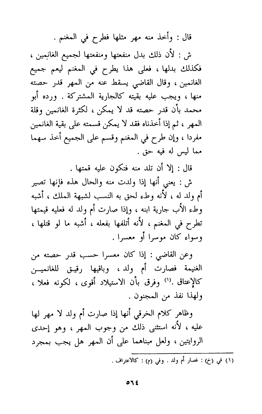 ش: لأن ذلك بدل منفعتها ومنفعتها لجميع الغانمين، فكذلك بدلها، فعلى هذا يطرح في المغنم ليعم جميع الغانمين، وقال القاضي يسقط عنه من المهر قدر حصته منها، ويجب عليه بقيته كالجارية المشتركة. ورده أبو محمد بأن قدر حصته قد لا يمكن، لكثرة الغانمين وقلة المهر، ثم إذا أخذناه فقد لا يمكن قسمته على بقية الغانمين مفردا، وإن طرح في المغنم وقسم على الجميع أخذ سهما مما ليس له فيه حق.