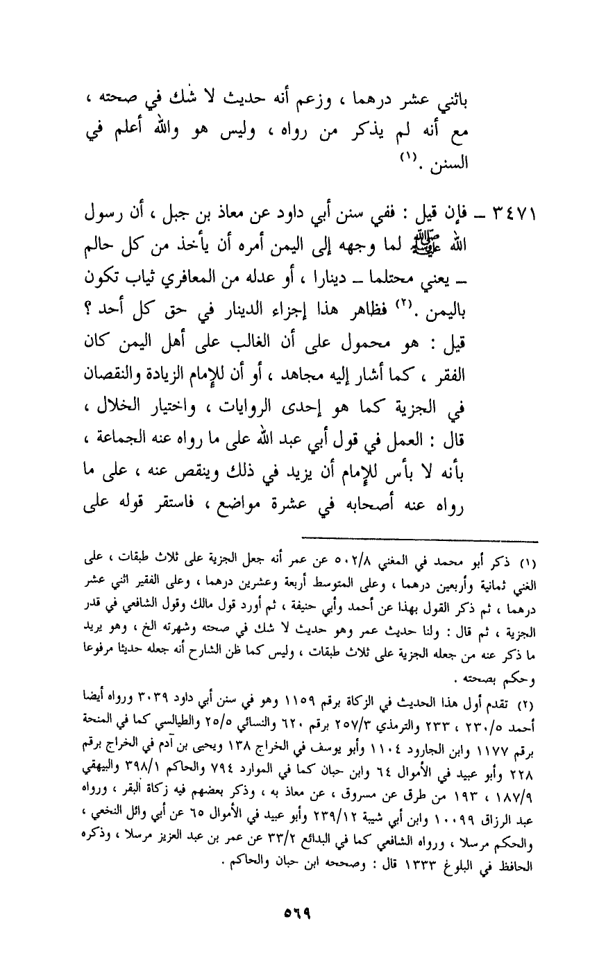 3471 - فإن قيل ففي سنن أبي داود عن معاذ بن جبل، «أن رسول الله - صَلَّى اللَّهُ عَلَيْهِ وَسَلَّمَ - لما وجهه إلى اليمن أمره أن يأخذ من كل حالم - يعني: محتلما - دينارا، أو عدله من المعافري» ، ثياب تكون باليمن، فظاهر هذا إجزاء الدينار في حق كل أحد؟