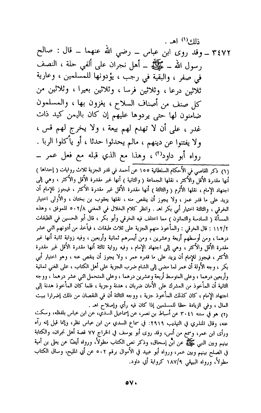 3472 - وقد «روى ابن عباس - رَضِيَ اللَّهُ عَنْهُمَا - قال: صالح رسول الله - صَلَّى اللَّهُ عَلَيْهِ وَسَلَّمَ - أهل نجران على ألفي حلة، النصف في صفر، والبقية في رجب، يؤدونها للمسلمين، وعارية ثلاثين درعا، وثلاثين فرسا، وثلاثين بعيرا، وثلاثين من كل صنف من أصناف السلاح، يغزون بها، والمسلمون ضامنون لها حتى يردوها عليهم إن كان باليمن كيد ذات غدر، على أن لا تهدم لهم بيعة، ولا يخرج لهم قس، ولا يفتنوا عن دينهم، ما لم يحدثوا حدثا، أو يأكلوا الربا» . رواه أبو داود، وهذا مع الذي قبله مع فعل عمر
