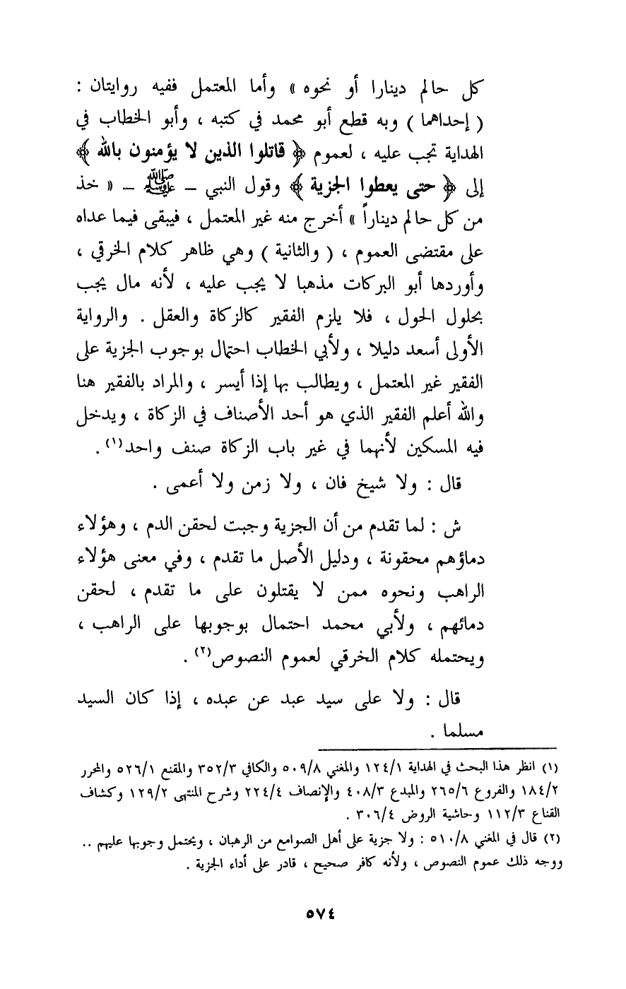 والرواية الأولى أسعد دليلا، ولأبي الخطاب احتمال بوجوب الجزية على الفقير غير المعتمل، ويطالب بها إذا أيسر، والمراد بالفقير هنا والله أعلم: الفقير الذي هو أحد الأصناف في الزكاة، ويدخل فيه المسكين لأنهما في غير باب الزكاة صنف واحد.