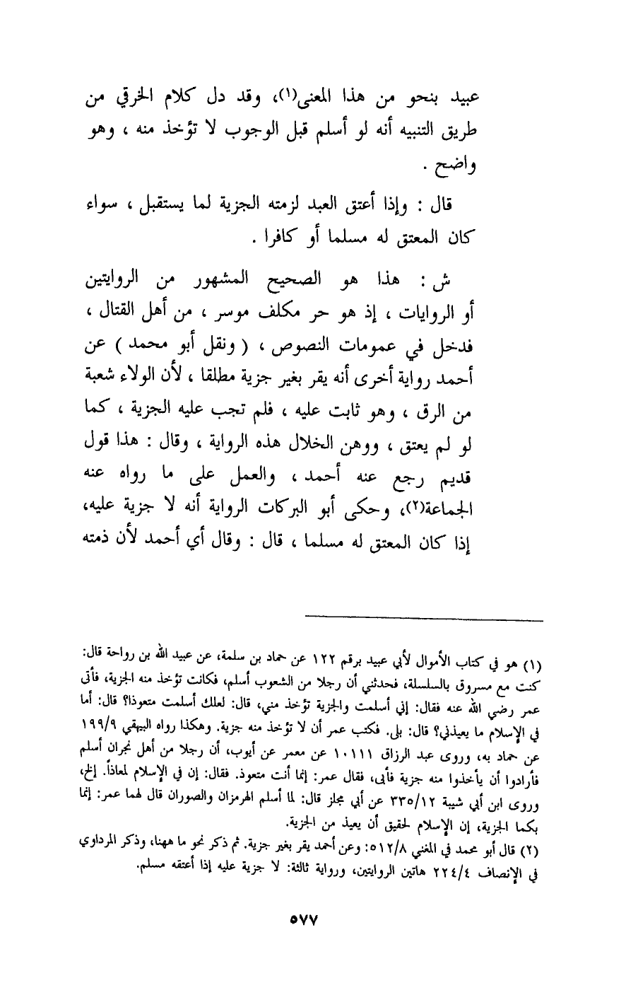 ش: هذا هو الصحيح المشهور من الروايتين أو الروايات، إذ هو حر مكلف موسر، من أهل القتال، فدخل في عمومات النصوص. (ونقل أبو محمد) عن أحمد رواية أخرى أنه يقر بغير جزية مطلقا، لأن الولاء شعبة من الرق، وهو ثابت عليه، فلم تجب عليه الجزية، كما لو لم يعتق. ووهن الخلال هذه الرواية، وقال: هذا قول قديم رجع عنه أحمد، والعمل على ما رواه عنه الجماعة. وحكى أبو البركات الرواية أنه لا جزية عليه، إذا كان المعتق له مسلما، قال: وقال، أي أحمد، لأن ذمته