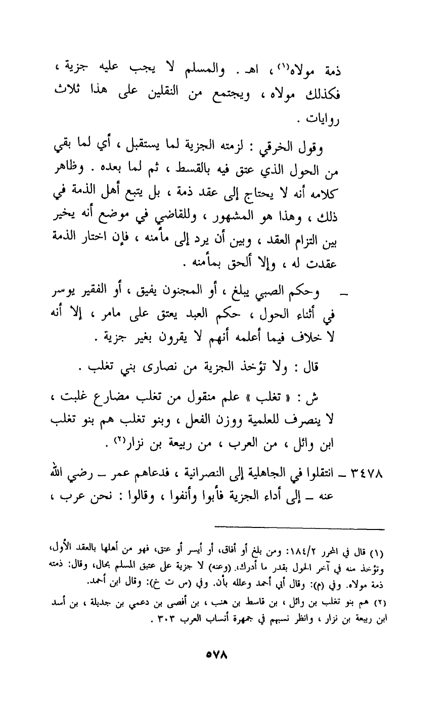 3478 - انتقلوا في الجاهلية إلى النصرانية، فدعاهم عمر - رَضِيَ اللَّهُ عَنْهُ - إلى أداء الجزية فأبوا وأنفوا، وقالوا: نحن عرب،