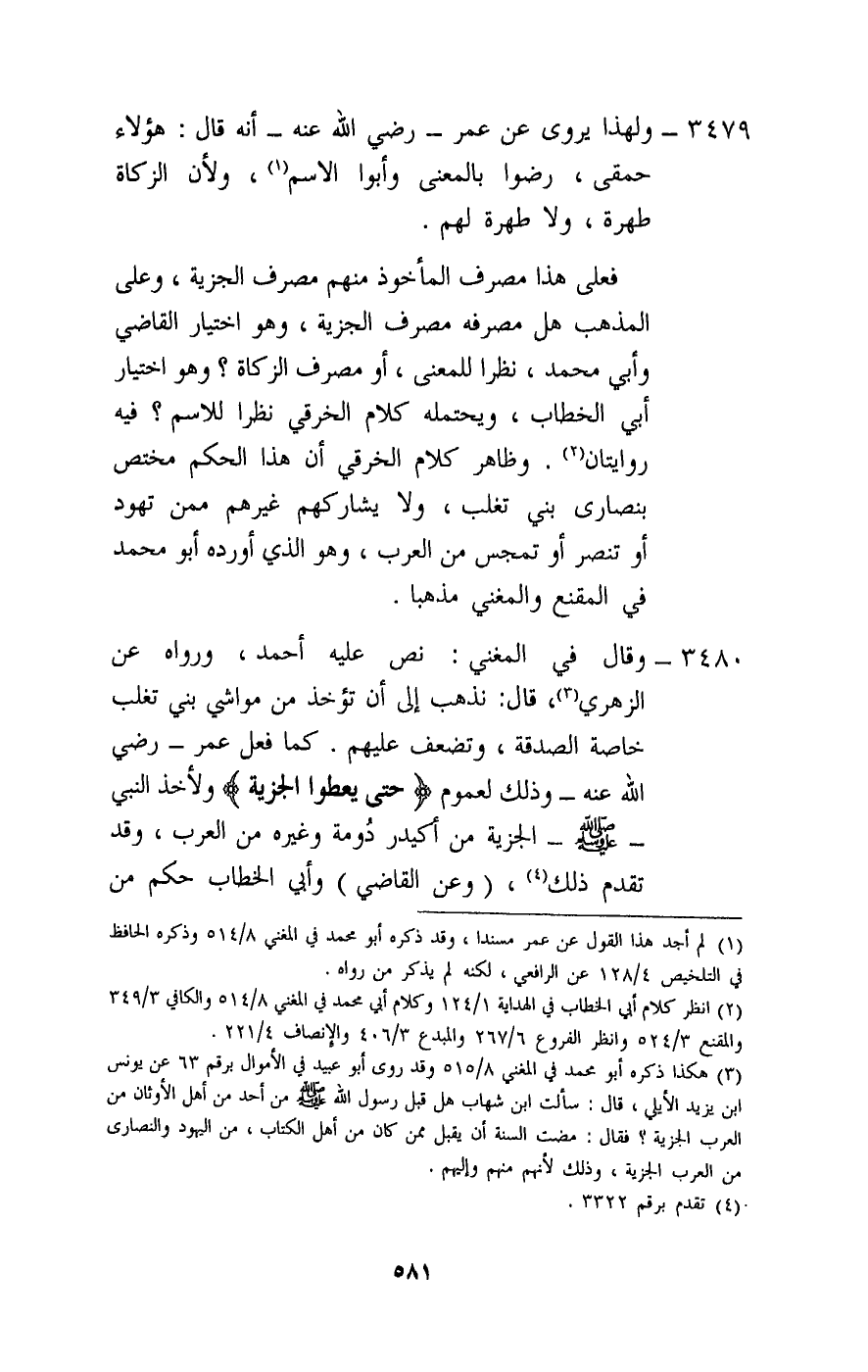 3479 - ولهذا يروى عن عمر - رَضِيَ اللَّهُ عَنْهُ - أنه قال: هؤلاء حمقى، رضوا بالمعنى وأبوا الاسم، ولأن الزكاة طهرة، ولا طهرة لهم.