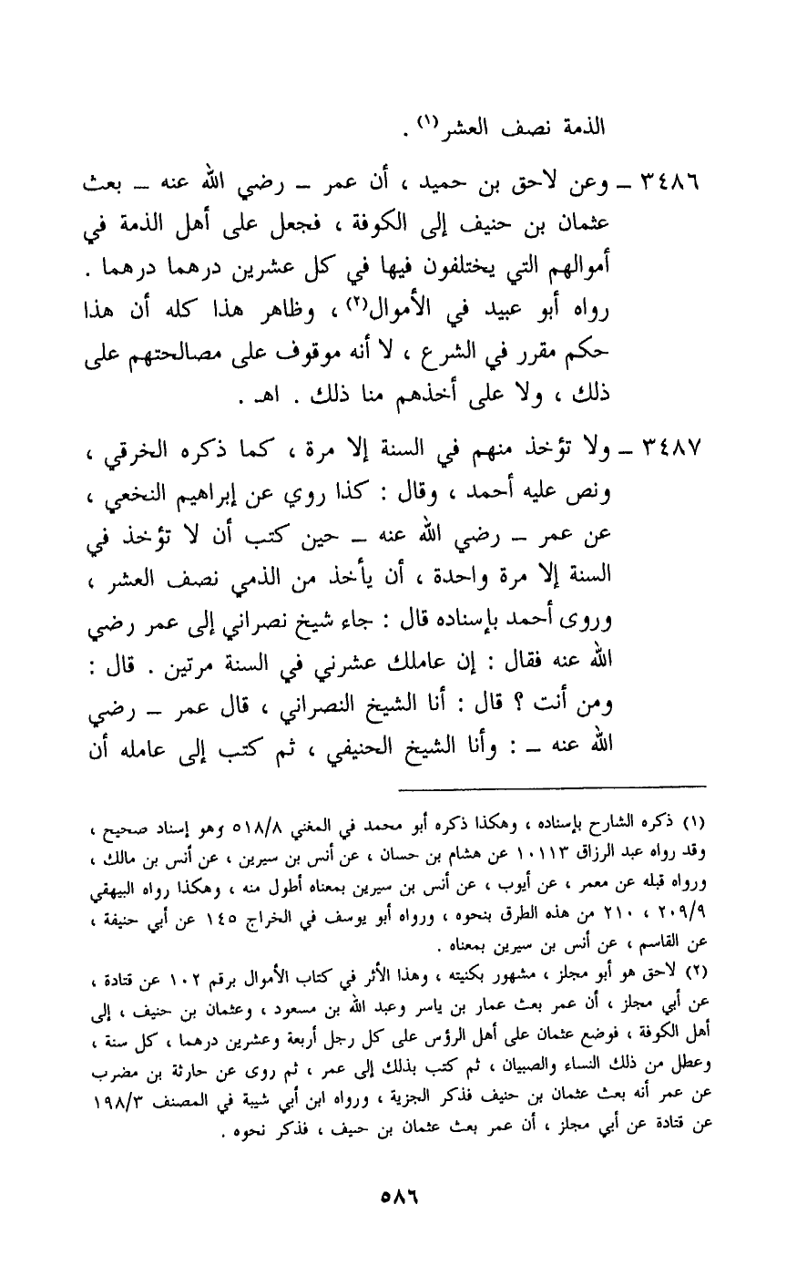 3486 - وعن لاحق بن حميد، أن عمر - رَضِيَ اللَّهُ عَنْهُ - بعث عثمان بن حنيف إلى الكوفة فجعل على أهل الذمة في أموالهم التي يختلفون فيها في كل عشرين درهما درهما. رواه أبو عبيد في الأموال، وظاهر هذا كله أن هذا حكم مقرر في الشرع، لا أنه موقوف على مصالحتهم على ذلك، ولا على أخذهم منا ذلك، اهـ.