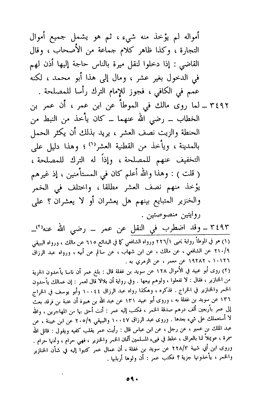 3492 - لما روى مالك في الموطأ عن ابن عمر، أن عمر بن الخطاب - رَضِيَ اللَّهُ عَنْهُمَا - كان يأخذ من النبط من الحنطة والزيت نصف العشر، يريد بذلك أن يكثر الحمل بالمدينة، ويأخذ من القطنية العشر؛ وهذا دليل على التخفيف عنهم للمصلحة، وإذا له الترك للمصلحة.