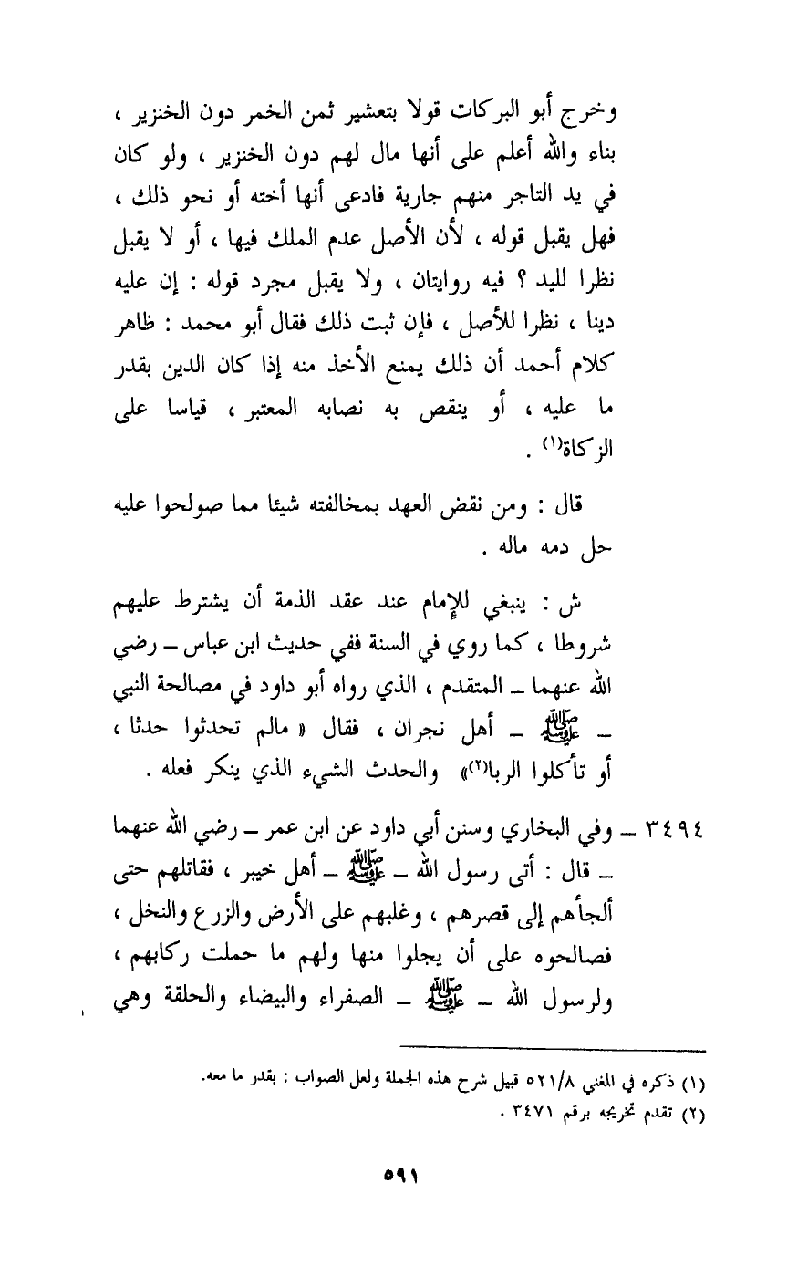 3494 - وفي البخاري وسنن أبي داود: «عن ابن عمر - رَضِيَ اللَّهُ عَنْهُمَا - قال: أتى رسول الله - صَلَّى اللَّهُ عَلَيْهِ وَسَلَّمَ - أهل خيبر، فقاتلهم حتى ألجأهم إلى قصرهم، وغلبهم على الأرض والزرع والنخل، فصالحوه على أن يجلوا منها ولهم ما حملت ركابهم، ولرسول الله - صَلَّى اللَّهُ عَلَيْهِ وَسَلَّمَ - الصفراء والبيضاء والحلقة، وهي