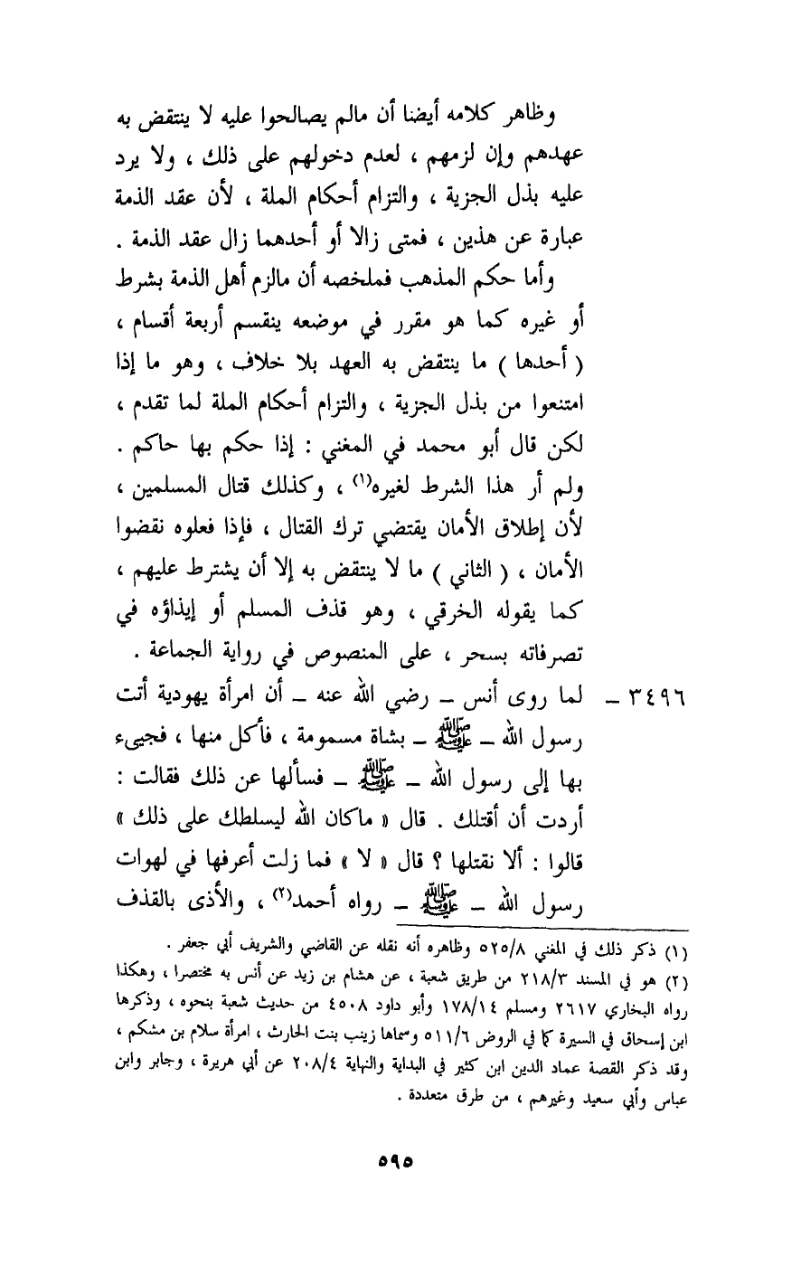3496 - لما روى أنس - رَضِيَ اللَّهُ عَنْهُ - «أن امرأة يهودية أتت رسول الله - صَلَّى اللَّهُ عَلَيْهِ وَسَلَّمَ - بشاة مسمومة، فأكل منها، فجيء بها إلى رسول الله - صَلَّى اللَّهُ عَلَيْهِ وَسَلَّمَ - فسألها عن ذلك فقالت: أردت أن أقتلك. قال: «ما كان الله ليسلطك على ذلك» قالوا: ألا نقتلها؟ قال: «لا» . فما زلت أعرفها في لهوات رسول الله - صَلَّى اللَّهُ عَلَيْهِ وَسَلَّمَ -» . رواه أحمد، والأذى بالقذف
