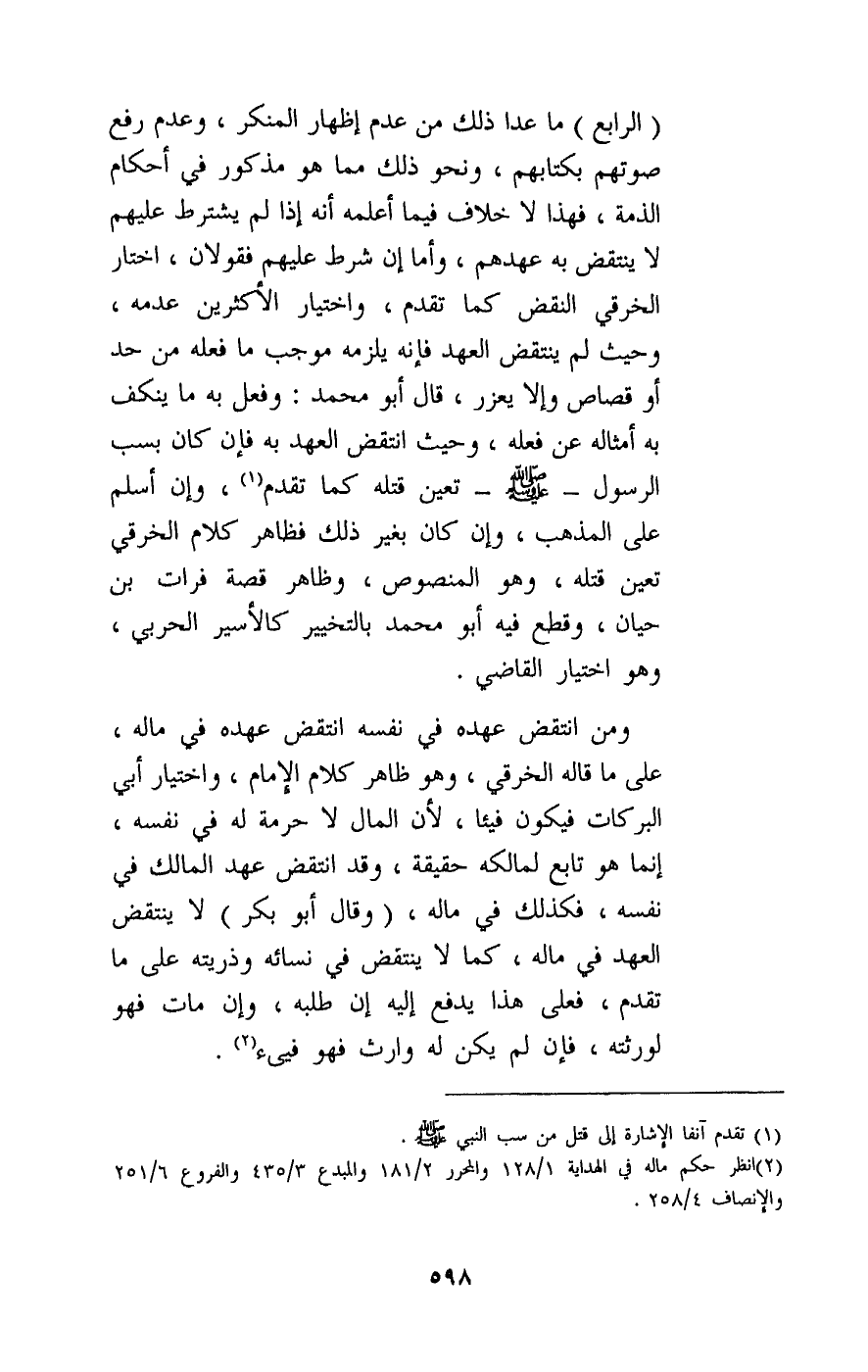 (الرابع) : ما عدا ذلك من عدم إظهار المنكر، وعدم رفع صوتهم بكتابهم، ونحو ذلك مما هو مذكور في أحكام الذمة، فهذا لا خلاف فيما أعلمه أنه إذا لم يشترط عليهم لا ينتقض به عهدهم، وأما إن شرط عليهم فقولان، اختار الخرقي النقض كما تقدم، واختيار الأكثرين عدمه.