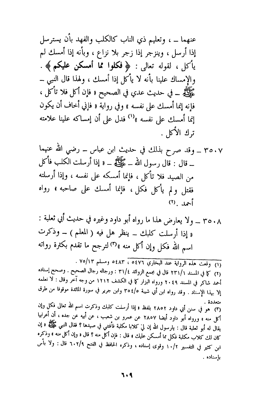 3508 - ولا يعارض هذا ما رواه أبو داود وغيره في حديث أبي ثعلبة: «إذا أرسلت كلبك - ينظر هل فيه (المعلم) - وذكرت اسم الله فكل وإن أكل منه» ، لترجح ما تقدم بكثرة رواته