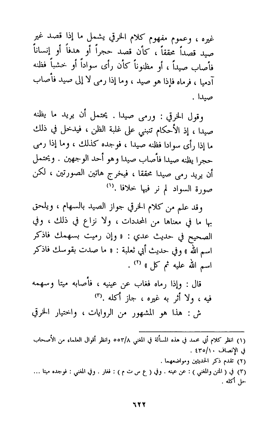 غيره، وعموم مفهوم كلام الخرقي يشمل ما إذا قصد غير صيدا قصدا محققا، كأن قصد حجرا أو هدفا أو إنسانا فأصاب صيدا، أو مظنونا كأن رأى سوادا أو خشبا فظنه آدميا، فرماه فإذا هو صيد، وما إذا رمى لا إلى صيد فأصاب صيدا. وقول الخرقي: ورمى صيدا، يحتمل أن يريد ما يظنه صيدا، إذ الأحكام تنبني على غلبة الظن، فيدخل في ذلك ما إذا رأى سوادا فظنه صيدا، فوجده كذلك، وما إذا رمى حجرا يظنه صيدا فأصاب صيدا، وهو أحد الوجهين، ويحتمل أن يريد: رمى صيدا محققا، فيخرج هاتين الصورتين، لكن صورة السواد لم نر فيها خلاقا.