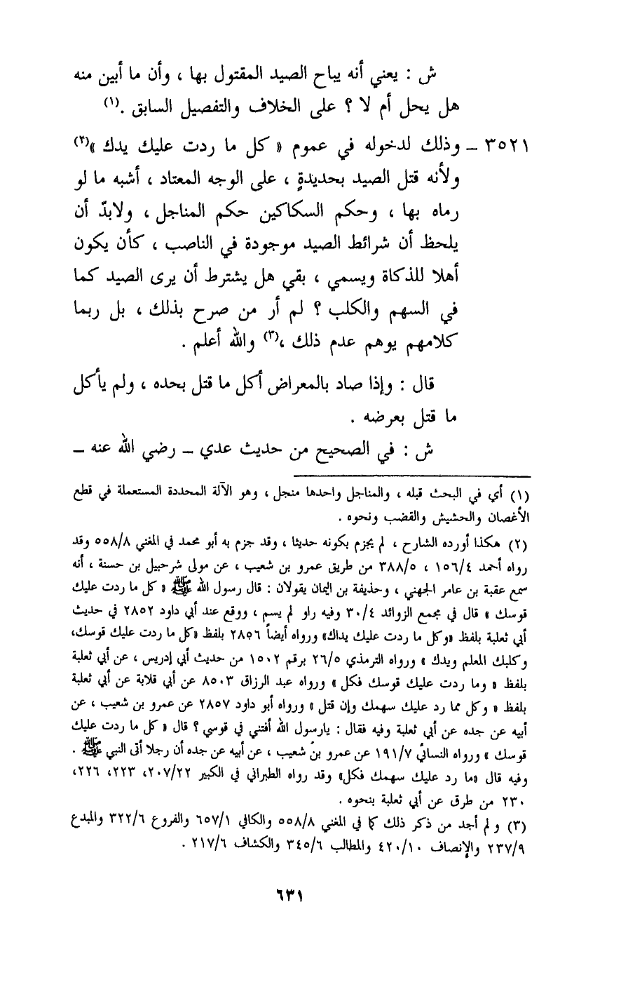 3521 - وذلك لدخوله في عموم: «كل ما ردت عليك يدك» ، ولأنه قتل الصيد بحديدة، على الوجه المعتاد، أشبه ما لو رماه بها، وحكم السكاكين حكم المناجل، ولا بد أن يلحظ أن شرائط الصيد موجودة في الناصب، كأن يكون أهلا للذكاة ويسمي.