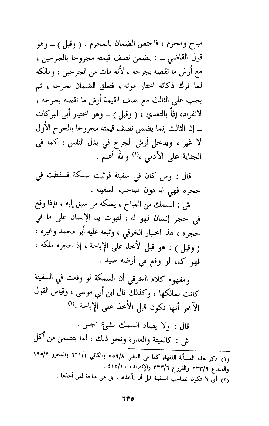 ش: السمك من المباح، يملكه من سبق إليه، فإذا وقع في حجر إنسان فهو له، لثبوت يد الإنسان على ما في حجره، هذا اختيار الخرقي، وتبعه عليه أبو محمد وغيره. (وقيل) : هو قبل الأخذ على الإباحة، إذ حجره ملكه، فهو كما لو وقع في أرضه صيد. ومفهوم كلام الخرقي أن السمكة لو وقعت في السفينة كانت لمالكها، وكذلك قال ابن أبي موسى، وقياس القول الآخر أنها تكون قبل الأخذ على الإباحة.