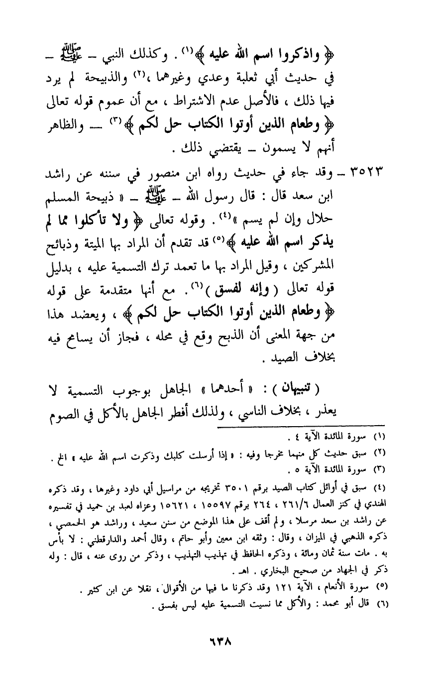 3523 - وقد جاء في حديث رواه ابن منصور في سننه، عن راشد بن سعد قال: قال رسول الله - صَلَّى اللَّهُ عَلَيْهِ وَسَلَّمَ -: «ذبيحة المسلم حلال وإن لم يسم» . وقَوْله تَعَالَى: {وَلَا تَأْكُلُوا مِمَّا لَمْ يُذْكَرِ اسْمُ اللَّهِ عَلَيْهِ} [الأنعام: 121] ، وقد تقدم أن المراد بها الميتة وذبائح المشركين، وقيل: المراد بها ما تعمد ترك التسمية عليه، بدليل قَوْله تَعَالَى: {وَإِنَّهُ لَفِسْقٌ} [الأنعام: 121] . مع أنها متقدمة على قوله: {وَطَعَامُ الَّذِينَ أُوتُوا الْكِتَابَ حِلٌّ لَكُمْ} [المائدة: 5] ، ويعضد هذا من جهة المعنى أن الذبح وقع في محله، فجاز أن يسامح فيه بخلاف الصيد.