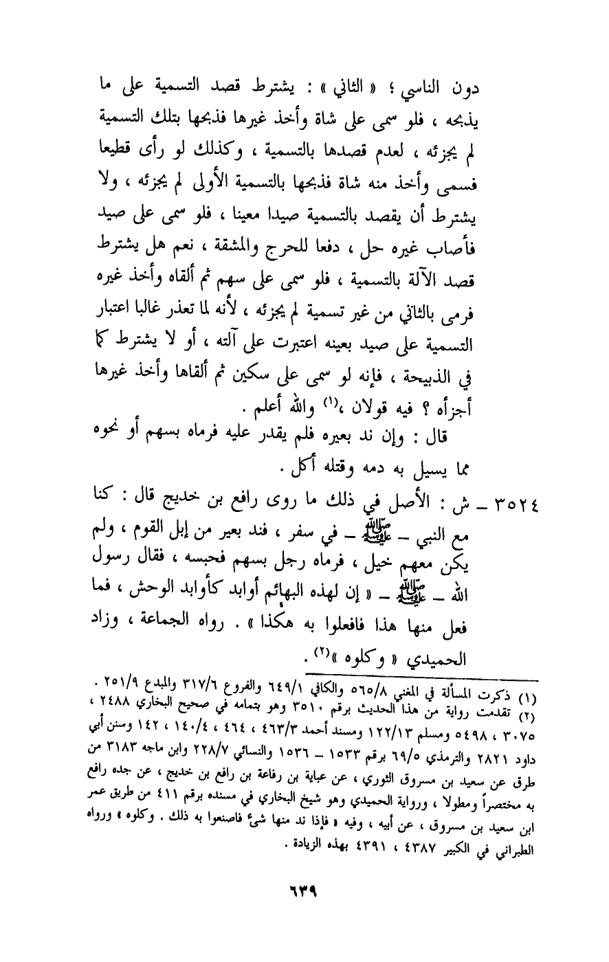 3524 - ش: الأصل في ذلك ما «روى رافع بن خديج قال: كنا مع النبي - صَلَّى اللَّهُ عَلَيْهِ وَسَلَّمَ - في سفر، فند بعير من إبل القوم، ولم يكن معهم خيل، فرماه رجل بسهم فحبسه، فقال رسول الله - صَلَّى اللَّهُ عَلَيْهِ وَسَلَّمَ -: «إن لهذه البهائم أوابد كأوابد الوحش، فما فعل منها هذا فافعلوه به هكذا» . رواه الجماعة، وزاد الحميدي: «وكلوه» .