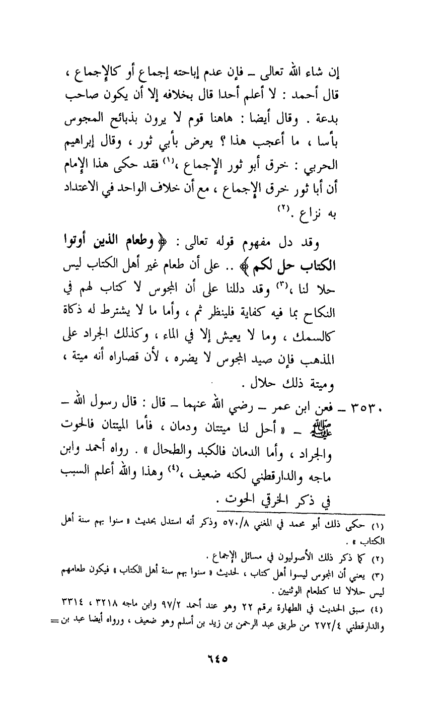 إن شاء الله تعالى - فإن عدم إباحته إجماع أو كالإجماع، قال أحمد: لا أعلم أحدا قال بخلافه إلا أن يكون صاحب بدعة، وقال أيضا: ها هنا قوم لا يرون بذبائح المجوس بأسا، ما أعجب هذا؟ يعرض بأبي ثور، وقال إبراهيم الحربي: خرق أبو ثور الإجماع، فقد حكى هذا الإمام أن أبا ثور خرق الإجماع، مع أن خلاف الواحد في الاعتداد به نزاع. وقد دل مفهوم قَوْله تَعَالَى: {وَطَعَامُ الَّذِينَ أُوتُوا الْكِتَابَ حِلٌّ لَكُمْ} [المائدة: 5] ، على أن طعام غير أهل الكتاب ليس حلا لنا، وقد دللنا على أن المجوس لا كتاب لهم في النكاح بما فيه كفاية فلينظر ثم.