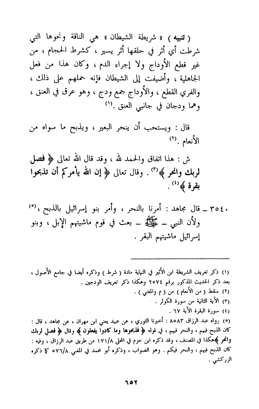 3540 - قال مجاهد: أمرنا بالنحر، وأمر بنو إسرائيل بالذبح، ولأن النبي - صَلَّى اللَّهُ عَلَيْهِ وَسَلَّمَ - بعث في قوم ماشيتهم الإبل، وبنو إسرائيل ماشيتهم البقر.