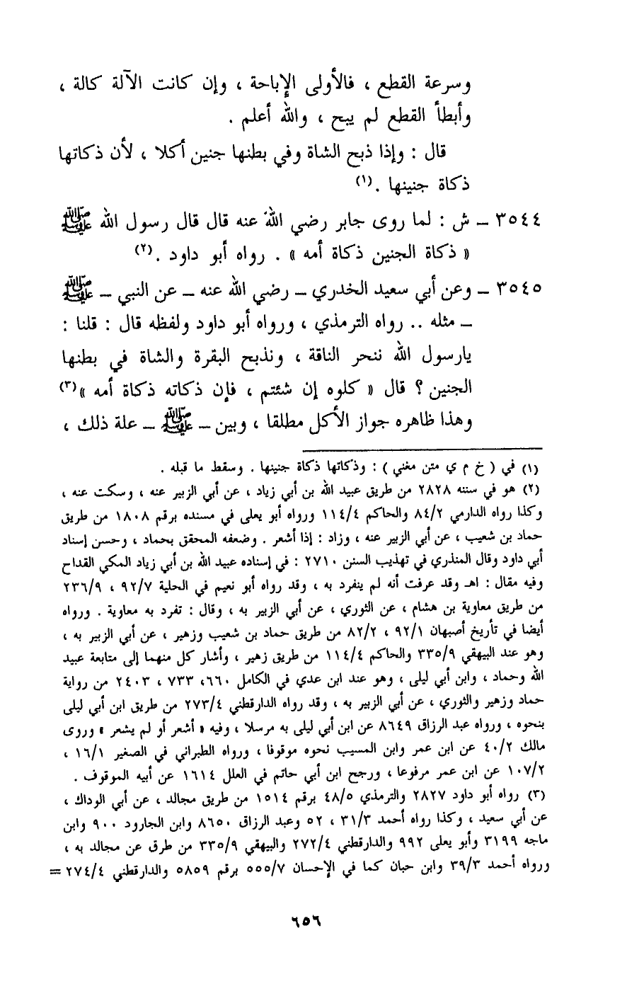3544 - ش: لما روى جابر - رَضِيَ اللَّهُ عَنْهُ - قال: قال رسول الله - صَلَّى اللَّهُ عَلَيْهِ وَسَلَّمَ -: «ذكاة الجنين ذكاة أمه» . رواه أبو داود.