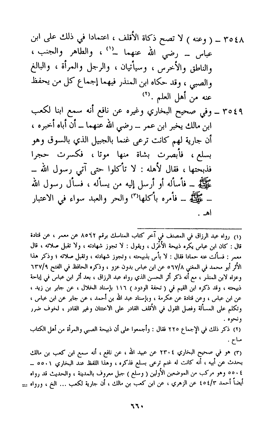 3549 - وفي صحيح البخاري وغيره «عن نافع أنه سمع ابنا لكعب بن مالك يخبر ابن عمر - رَضِيَ اللَّهُ عَنْهُمَا - أن أباه أخبره، أن جارية لهم كانت ترعى غنما بالجبيل الذي بالسوق وهو بسلع، فأبصرت بشاة منها موتا، فكسرت حجرا فذبحتها، فقال لأهله: لا تأكلوا حتى آتي رسول الله - صَلَّى اللَّهُ عَلَيْهِ وَسَلَّمَ - فأسأله أو أرسل إليه من يسأله، فسأل رسول الله - صَلَّى اللَّهُ عَلَيْهِ وَسَلَّمَ - فأمره بأكلها والحر والعبد سواء في الاعتبار» ، اهـ.