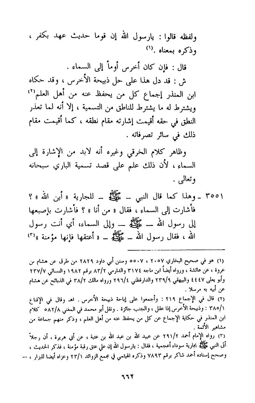 3551 - وهذا كما «قال النبي - صَلَّى اللَّهُ عَلَيْهِ وَسَلَّمَ - للجارية: «أين الله» ؟ فأشارت إلى السماء، فقال: «من أنا» ؟ فأشارت بأصبعها إلى رسول الله - صَلَّى اللَّهُ عَلَيْهِ وَسَلَّمَ - وإلى السماء، أي أنت رسول الله - صَلَّى اللَّهُ عَلَيْهِ وَسَلَّمَ - فقال رسول الله - صَلَّى اللَّهُ عَلَيْهِ وَسَلَّمَ -: «أعتقها فإنها مؤمنة» .»