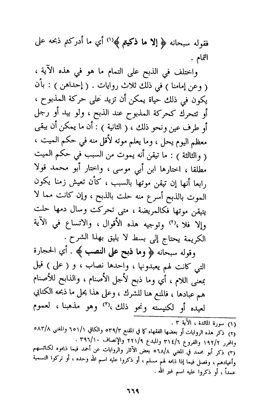 واختلف في الذبح على التمام ما هو في هذه الآية، (وعن إمامنا) في ذلك ثلاث روايات. (إحداهن) : بأن يكون في ذلك حياة يمكن أن تزيد على حركة المذبوح، أو تتحرك كحركة المذبوح عند الذبح، ولو بيد أو رجل أو طرف عين ونحو ذلك.