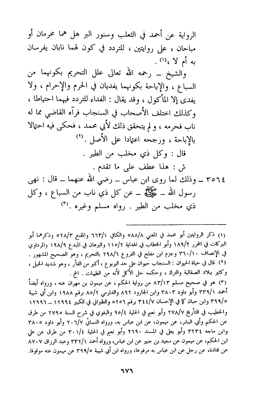 3564 - وذلك لما روى ابن عباس - رَضِيَ اللَّهُ عَنْهُمَا - قال: «نهى رسول الله - صَلَّى اللَّهُ عَلَيْهِ وَسَلَّمَ - عن كل ذي ناب من السباع، وكل ذي مخلب من الطير» . رواه مسلم وغيره.