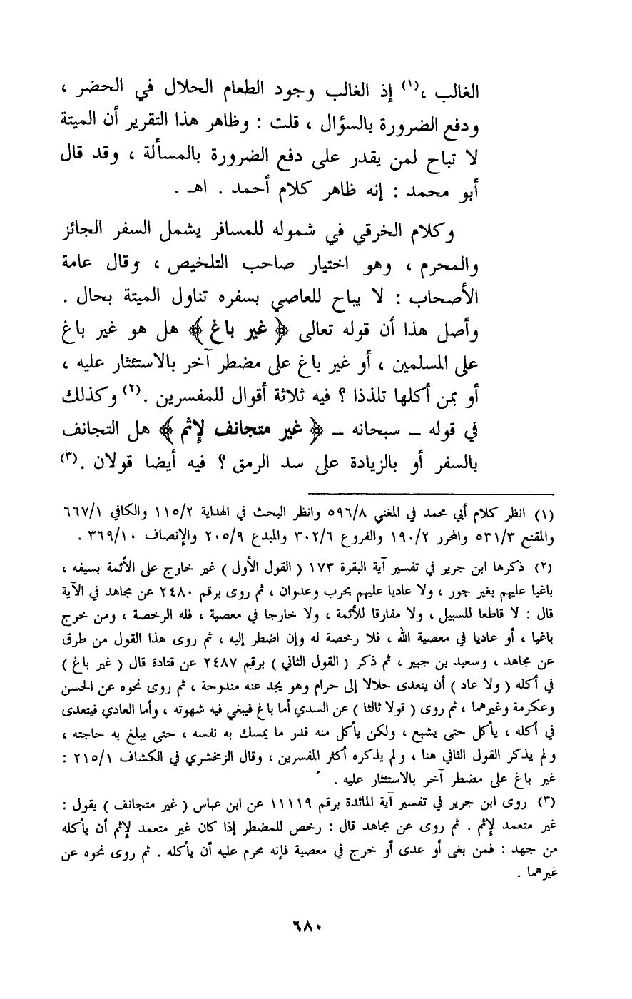 وكلام الخرقي في شموله للمسافر يشمل السفر الجائز والمحرم، وهو اختيار صاحب التلخيص، وقال عامة الأصحاب: لا يباح للعاصي بسفره تناول الميتة بحال، وأصل هذا أن قَوْله تَعَالَى: {غَيْرَ بَاغٍ} [البقرة: 173] ، هل هو غير باغ على المسلمين، أو غير باغ على مضطر آخر بالاستئثار عليه، أو بمن أكلها تلذذا؟ فيه ثلاثة أقوال للمفسرين. وكذلك في قوله - سبحانه -: {غَيْرَ مُتَجَانِفٍ لِإِثْمٍ} [المائدة: 3] ، هل التجانف بالسفر أو بالزيادة على سد الرمق؟ فيه أيضا قولان.