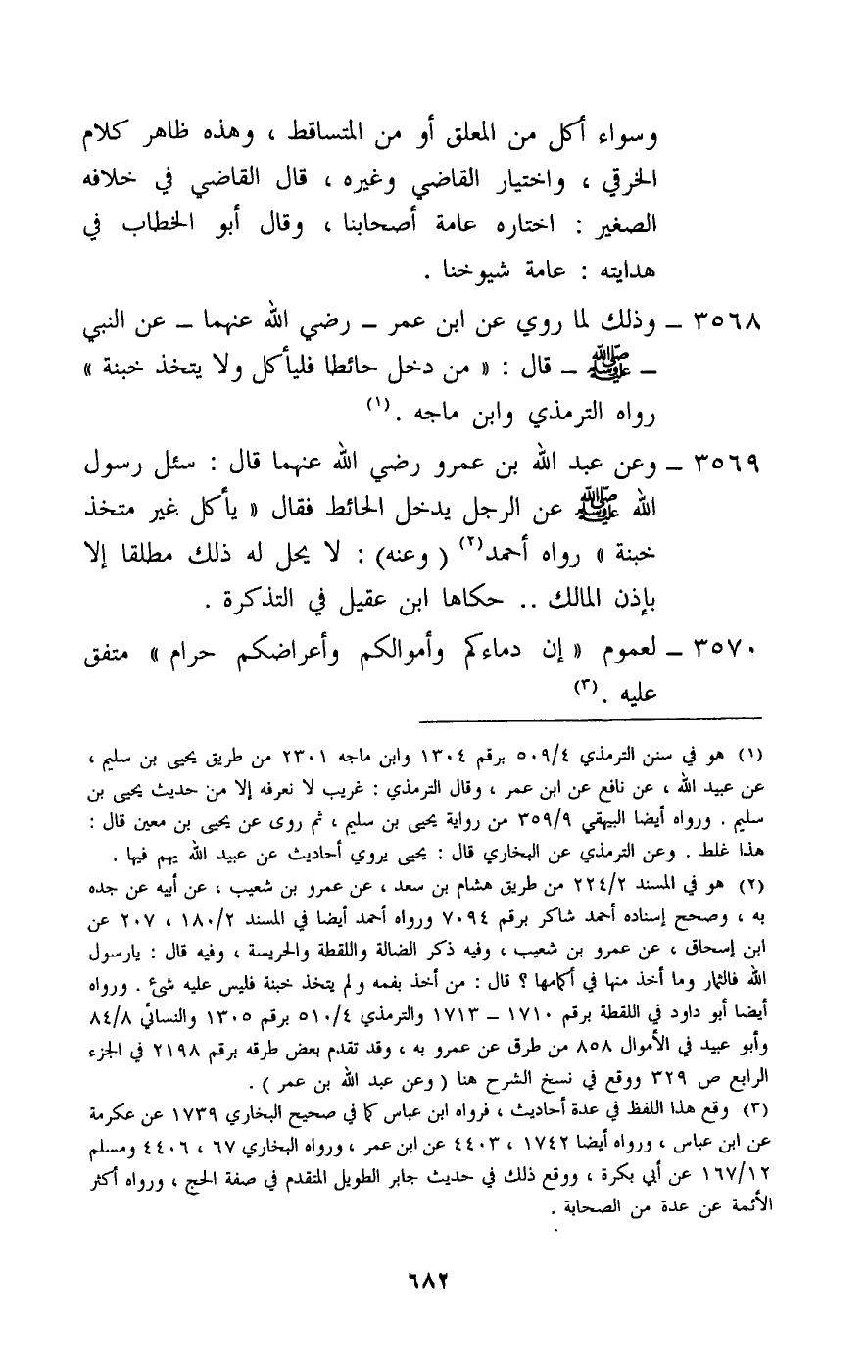 3569 - وعن عبد الله بن عمرو، - رَضِيَ اللَّهُ عَنْهُمَا -، قال: «سئل رسول الله - صَلَّى اللَّهُ عَلَيْهِ وَسَلَّمَ - عن الرجل يدخل الحائط فقال: «يأكل غير متخذ خبنة» . رواه أحمد، (وعنه) : لا يحل له ذلك مطلقا إلا بإذن المالك. حكاها ابن عقيل في التذكرة.