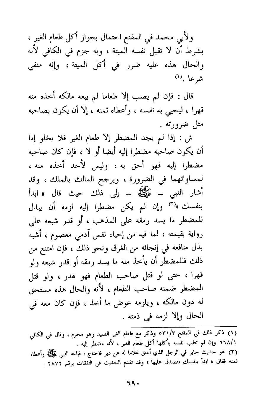 ش: إذا لم يجد المضطر إلى طعام الغير فلا يخلو إما أن يكون صاحبه مضطرا إليه أيضا أو لا، فإن كان صاحبه مضطرا إليه فهو أحق به، وليس لأحد أخذه منه، لمساواتهما في الضرورة، ويرجح المالك بالملك، وقد أشار النبي - صَلَّى اللَّهُ عَلَيْهِ وَسَلَّمَ - إلى ذلك حيث قال: «ابدأ بنفسك» . وإن لم يكن مضطرا إليه لزمه أن يبذل للمضطر ما يسد رمقه على المذهب، أو قدر شبعه على رواية بقيمته، لما فيه من إحياء نفس آدمي معصوم، أشبه بذلك منافعه في إنجائه من الغرق ونحو ذلك، فإن امتنع من ذلك فللمضطر أن يأخذ منه ما يسد رمقه أو قدر شبعه ولو قهرا، حتى لو قتل صاحب الطعام فهو هدر، ولو قتل المضطر ضمنه صاحب الطعام، لأنه والحال هذه مستحق له دون مالكه، ويلزمه عوض ما أخذ، فإن كان معه في الحال وإلا لزمه في ذمته.
