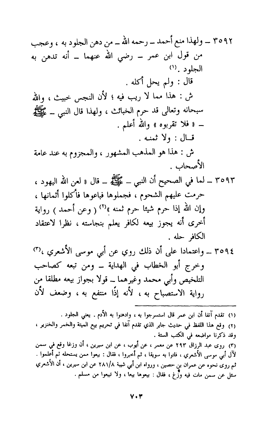 3592 - ولهذا منع أحمد - رَحِمَهُ اللَّهُ - من دهن الجلود به، وعجب من قول ابن عمر - رَضِيَ اللَّهُ عَنْهُمَا - أنه تدهن به الجلود.
