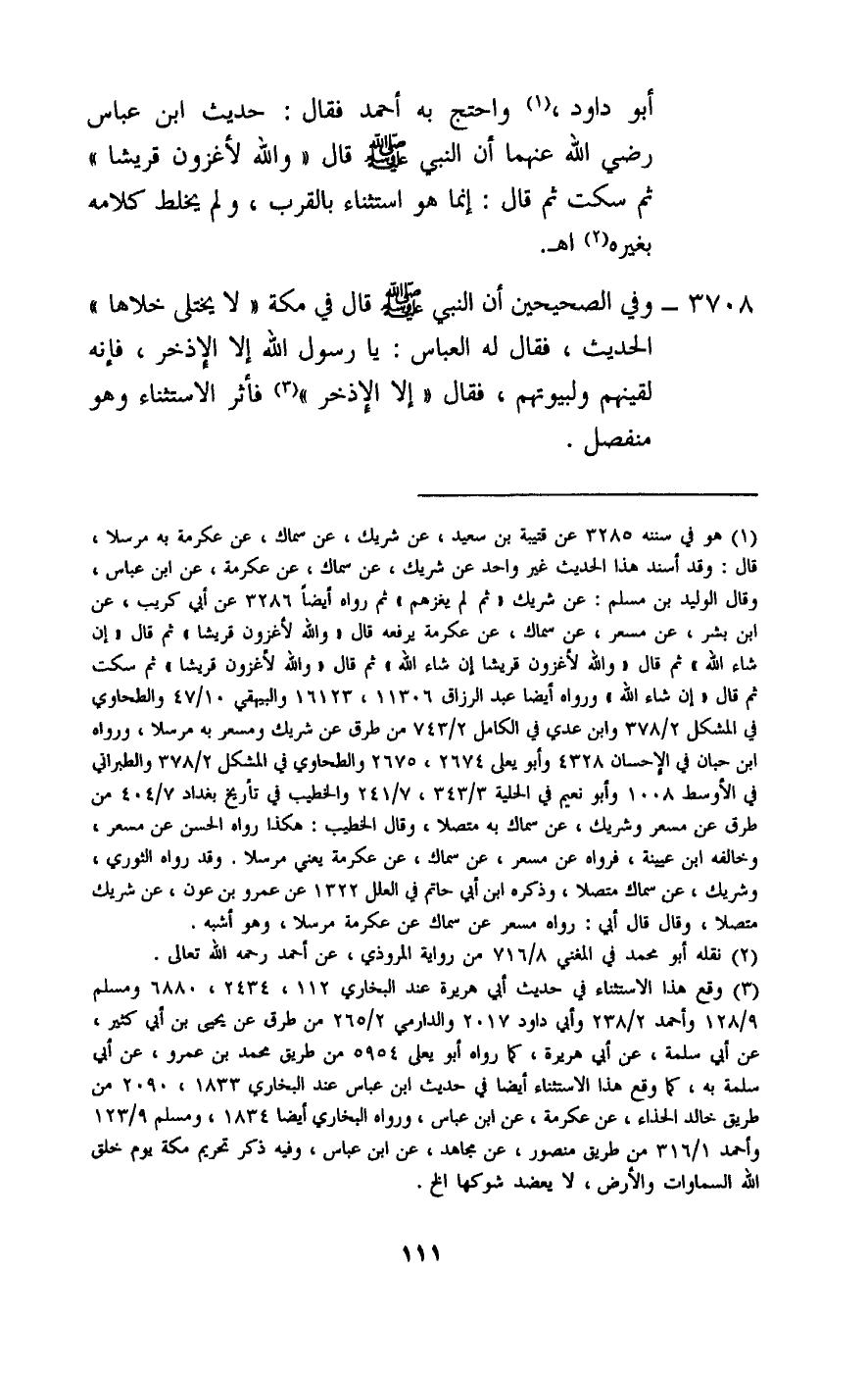 3708 - وفي الصحيحين «أن النبي - صَلَّى اللَّهُ عَلَيْهِ وَسَلَّمَ - قال في مكة: لا يختلى خلاها الحديث، فقال له العباس: يا رسول الله إلا الإذخر، فإنه لقينهم ولبيوتهم، فقال: إلا الإذخر» فأثر الاستثناء وهو منفصل.