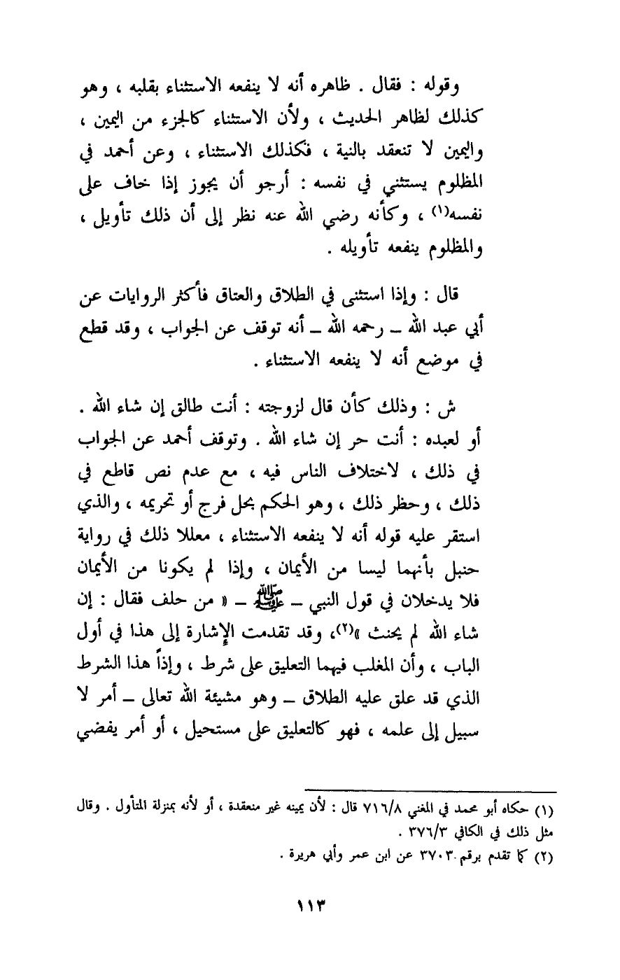 ش: وذلك كأن قال لزوجته: أنت طالق إن شاء الله. أو لعبده: أنت حر إن شاء الله. وتوقف أحمد عن الجواب في ذلك، لاختلاف الناس فيه، مع عدم نص قاطع في ذلك، وحظر ذلك، وهو الحكم بحل فرج أو تحريمه، والذي استقر عليه قوله أنه لا ينفعه الاستثناء، معللا ذلك في رواية حنبل بأنهما ليسا من الأيمان، وإذا لم يكونا من الأيمان فلا يدخلان في قول النبي - صَلَّى اللَّهُ عَلَيْهِ وَسَلَّمَ - «من حلف فقال: إن شاء الله لم يحنث» ، وقد تقدمت الإشارة إلى هذا في أول الباب، وأن المغلب فيهما التعليق على شرط، وإذا هذا الشرط الذي قد علق عليه الطلاق - وهو مشيئة الله تعالى - أمر لا سبيل إلى علمه، فهو كالتعليق على مستحيل، أو أمر يفضي