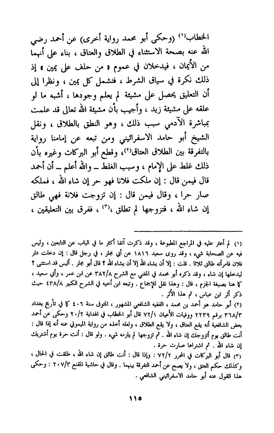 الخطاب (وحكى أبو محمد رواية أخرى) عن أحمد - رَضِيَ اللَّهُ عَنْهُ - بصحة الاستثناء في الطلاق والعتاق، بناء على أنهما من الأيمان، فيدخلان في عموم من حلف على يمين إذ ذلك نكرة في سياق الشرط، فتشمل كل يمين، ونظرا إلى أن التعليق يحصل على مشيئة لم يعلم وجودها، أشبه ما لو علقه على مشيئة زيد، وأجيب بأن مشيئة الله تعالى قد علمت بمباشرة الآدمي سبب ذلك، وهو النطق بالطلاق، ونقل الشيخ أبو حامد الاسفرائيني ومن تبعه عن إمامنا رواية بالتفرقة بين الطلاق العتاق، وقطع أبو البركات وغيره بأن ذلك غلط على الإمام، وسبب الغلط - والله أعلم - أن أحمد قال فيمن قال: إن ملكت فلانا فهو حر إن شاء الله، فملكه صار حرا، وقال فيمن قال: إن تزوجت فلانة فهي طالق إن شاء الله، فتزوجها لم تطلق، ففرق بين التعليقين،