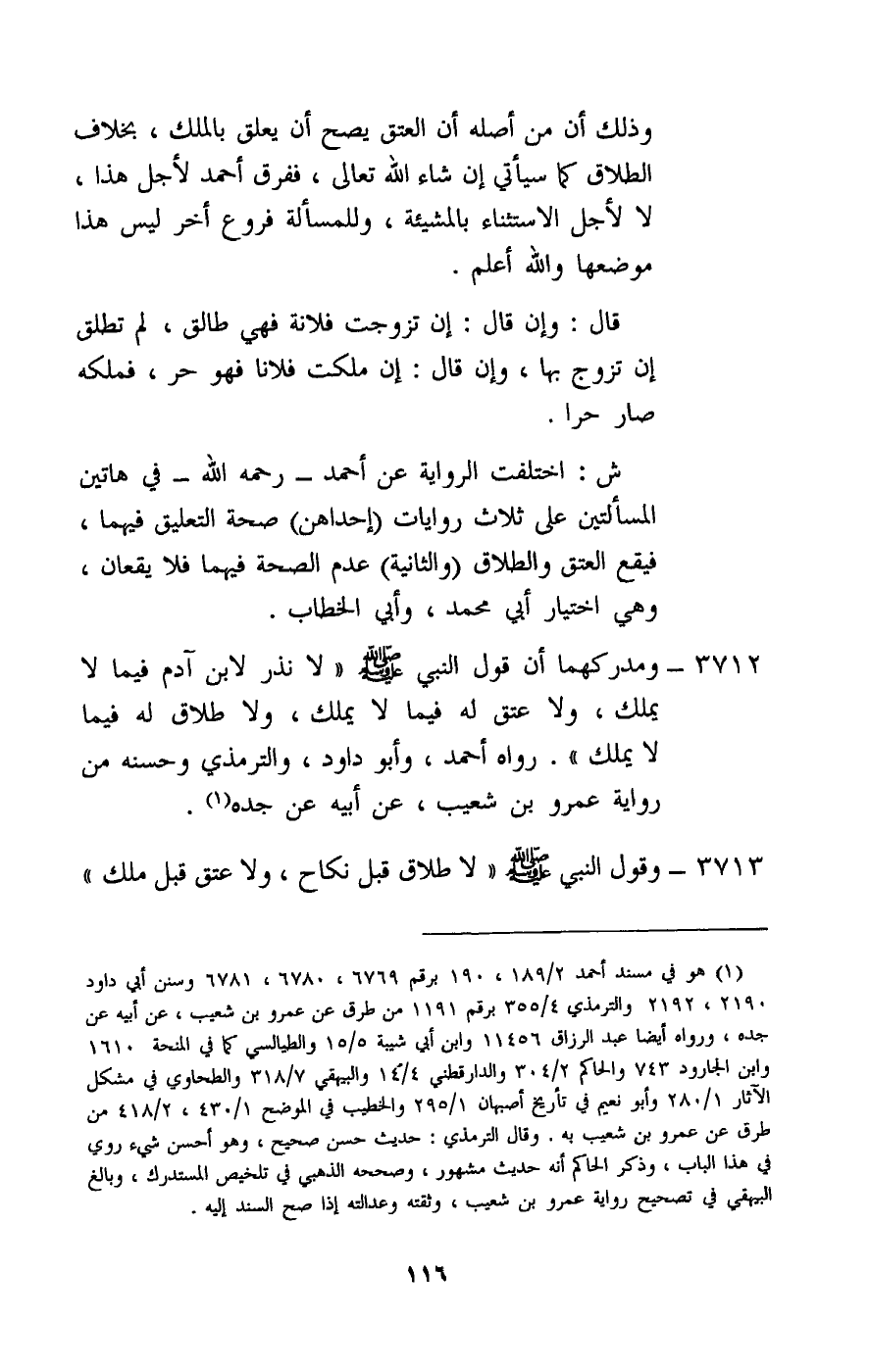 3712 - ومدركهما أن قول النبي - صَلَّى اللَّهُ عَلَيْهِ وَسَلَّمَ -: «لا نذر لابن آدم فيما لا يملك، ولا عتق له فيما لا يملك، ولا طلاق له فيما لا يملك» . رواه أحمد، وأبو داود، والترمذي وحسنه من رواية عمرو بن شعيب، عن أبيه عن جده.