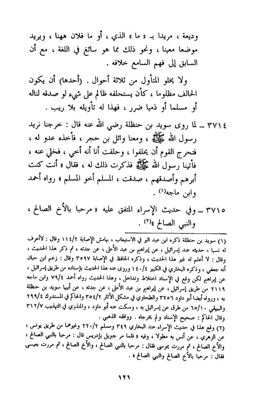 3714 - لما «روى سويد بن حنظلة - رَضِيَ اللَّهُ عَنْهُ -، قال: خرجنا نريد رسول الله - صَلَّى اللَّهُ عَلَيْهِ وَسَلَّمَ -، ومعنا وائل بن حجر، فأخذه عدو له، فتحرج القوم أن يحلفوا، وحلفت أنا أنه أخي، فخلي عنه، فأتينا رسول الله - صَلَّى اللَّهُ عَلَيْهِ وَسَلَّمَ - فذكرت ذلك له، فقال: «أنت كنت أبرهم وأصدقهم، صدقت، المسلم أخو المسلم» رواه أحمد وابن ماجه.