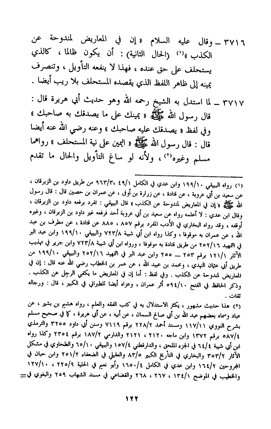 3716 - وقال - عَلَيْهِ السَّلَامُ -: «إن في المعاريض لمندوحة عن الكذب» ، (الحال الثانية) : أن يكون ظالما، كالذي يستحلف على حق عنده، فهذا لا ينفعه التأويل، وتنصرف يمينه إلى ظاهر اللفظ الذي يقصده المستحلف بلا ريب أيضا.