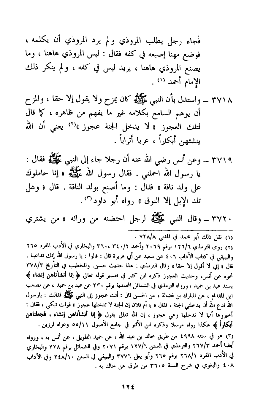 3719 - وعن أنس - رَضِيَ اللَّهُ عَنْهُ - «أن رجلا جاء إلى النبي - صَلَّى اللَّهُ عَلَيْهِ وَسَلَّمَ - فقال: يا رسول الله احملني. فقال رسول الله - صَلَّى اللَّهُ عَلَيْهِ وَسَلَّمَ -: «إنا حاملوك على ولد ناقة» فقال: وما أصنع بولد الناقة. قال: «وهل تلد الإبل إلا النوق» رواه أبو داود.