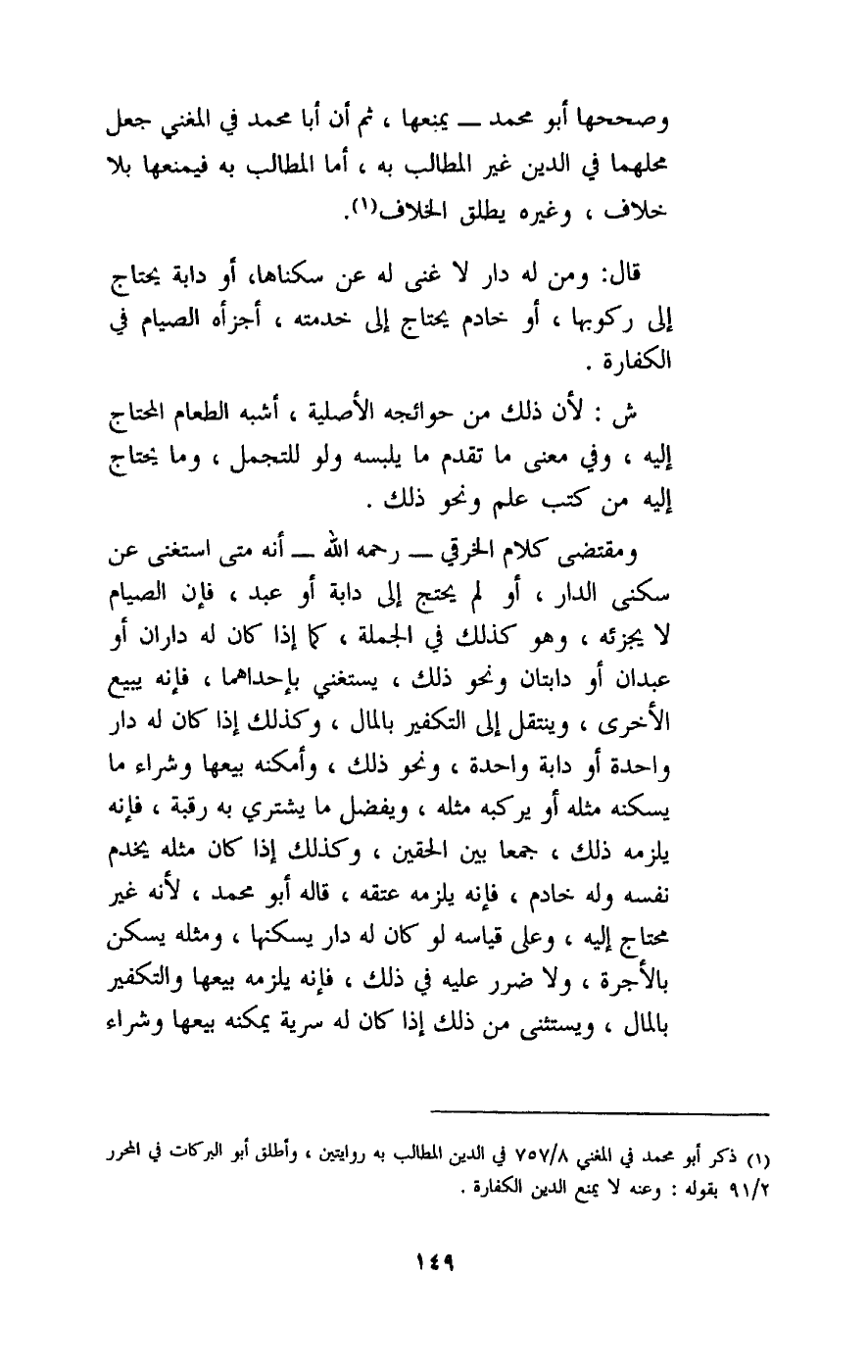 ش: لأن ذلك من حوائجه الأصلية، أشبه الطعام المحتاج إليه، وفي معنى ما تقدم ما يلبسه ولو للتجمل، وما يحتاج إليه من كتب علم ونحو ذلك. ومقتضى كلام الخرقي - رَحِمَهُ اللَّهُ - أنه متى استغنى عن سكنى الدار، أو لم يحتج إلى دابة أو عبد، فإن الصيام لا يجزئه، وهو كذلك في الجملة، كما إذا كان له داران أو عبدان أو دابتان ونحو ذلك، يستغني بإحداهما، فإنه يبيع الأخرى، وينتقل إلى التكفير بالمال، وكذلك إذا كان له دار واحدة أو دابة واحدة، ونحو ذلك، وأمكنه بيعها وشراء ما يسكنه مثله أو يركبه مثله، ويفضل ما يشتري به رقبة، فإنه يلزمه ذلك، جمعا بين الحقين، وكذلك إذا كان مثله يخدم نفسه وله خادم، فإنه يلزمه عتقه، قاله أبو محمد، لأنه غير محتاج إليه، وعلى قياسه لو كان له دار يسكنها، ومثله يسكن بالأجرة، ولا ضرر عليه في ذلك، فإنه يلزمه بيعها والتكفير بالمال، ويستثنى من ذلك إذا كان له سرية يمكنه بيعها وشراء