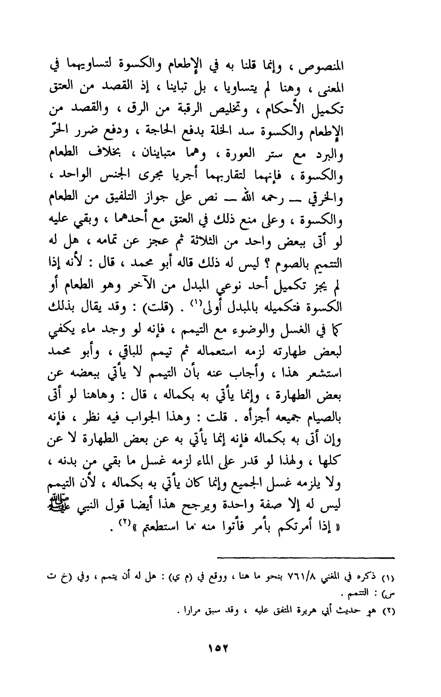 (قلت) : وقد يقال بذلك كما في الغسل والوضوء مع التيمم، فإنه لو وجد ماء يكفي لبعض طهارته لزمه استعماله ثم تيمم للباقي، وأبو محمد استشعر هذا، وأجاب عنه بأن التيمم لا يأتي ببعضه عن بعض الطهارة، وإنما يأتي به بكماله، قال: وها هنا لو أتى بالصيام جميعه أجزأه. قلت: وهذا الجواب فيه نظر، فإنه وإن أتى به بكماله، فإنه إنما يأتي به عن بعض الطهارة لا عن كلها، ولهذا لو قدر على الماء لزمه غسل ما بقي من بدنه ولا يلزمه غسل الجميع وإنما كان يأتي به بكماله، لأنه التيمم ليس له إلا صفة واحدة ويرجح هذا أيضا قول النبي - صَلَّى اللَّهُ عَلَيْهِ وَسَلَّمَ -: «إذا أمرتكم بأمر فأتوا منه ما استطعتم» .