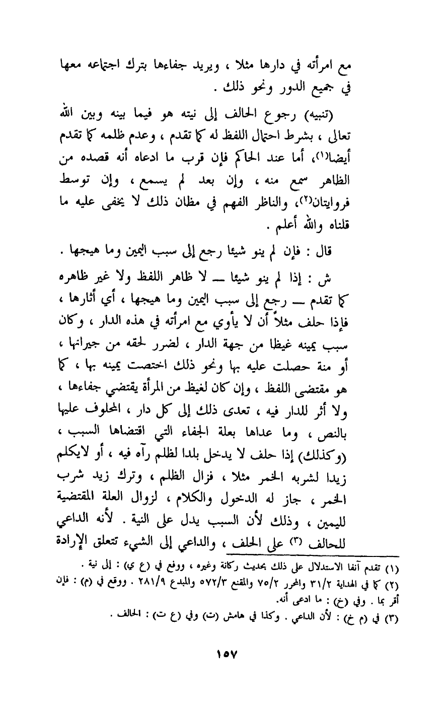 ش: إذا لم ينو شيئا - لا ظاهر اللفظ ولا غير ظاهره كما تقدم - رجع إلى سبب اليمين وما هيجها، أي أثارها، فإذا حلف مثلا أن لا يأوي مع امرأته في هذه الدار، وكان سبب يمينه غيظا من جهة الدار، لضرر لحقه من جيرانها، أو منة حصلت عليه بها ونحو ذلك اختصت يمينه بها كما هو مقتضى اللفظ، وإن كان لغيظ من المرأة يقتضي جفاءها، ولا أثر للدار فيه، تعدى ذلك إلى كل دار، المحلوف عليها بالنص، وما عداها بعلة الجفاء التي اقتضاها السبب، (وكذلك) : إذا حلف لا يدخل بلدا لظلم رآه فيه، أو لا يكلم زيدا لشربه الخمر مثلا، فزال الظلم، وترك زيد شرب الخمر، جاز له الدخول والكلام، لزوال العلة المقتضية لليمين، وذلك لأن السبب يدل على النية؛ لأنه الداعي للحالف على الحلف، والداعي إلى الشيء تتعلق الإرادة