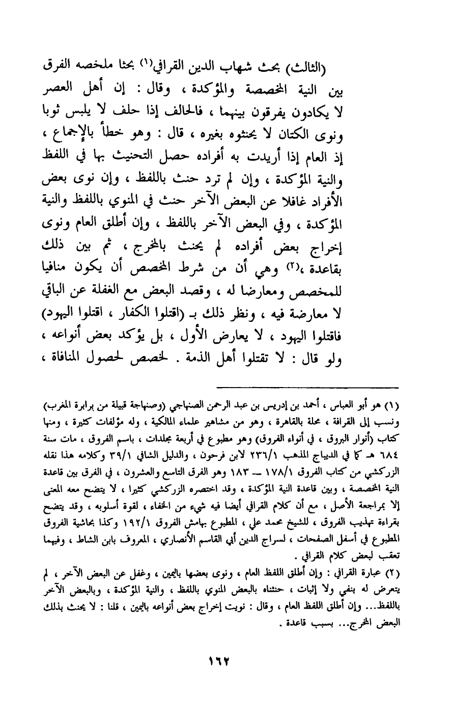 (الثالث) : بحث شهاب الدين القرافي بحثا ملخصه الفرق بين النية المخصصة والمؤكدة، وقال: إن أهل العصر لا يكادون يفرقون بينهما، فالحالف إذا حلف لا يلبس ثوبا ونوى الكتان لا يحنثوه بغيره، قال: وهو خطأ بالإجماع، إذ العام إذا أريدت به أفراده حصل التحنيث بها في اللفظ والنية المؤكدة، وإن لم ترد حنث باللفظ، وإن نوى بعض الأفراد غافلا عن البعض الآخر حنث في المنوي باللفظ والنية المؤكدة وفي البعض الآخر باللفظ، وإن أطلق العام ونوى إخراج بعض أفراده لم يحنث بالمخرج، ثم بين ذلك بقاعدة، وهي أن من شرط المخصص أن يكون منافيا للمخصص ومعارضا له، وقصد البعض مع الغفلة عن الباقي لا معارضة فيه، ونظر ذلك بـ (اقتلوا الكفار، اقتلوا اليهود) فاقتلوا اليهود، لا يعارض الأول، بل يؤكد بعض أنواعه، ولو قال: لا تقتلوا أهل الذمة؛ لخصص لحصول المنافاة،