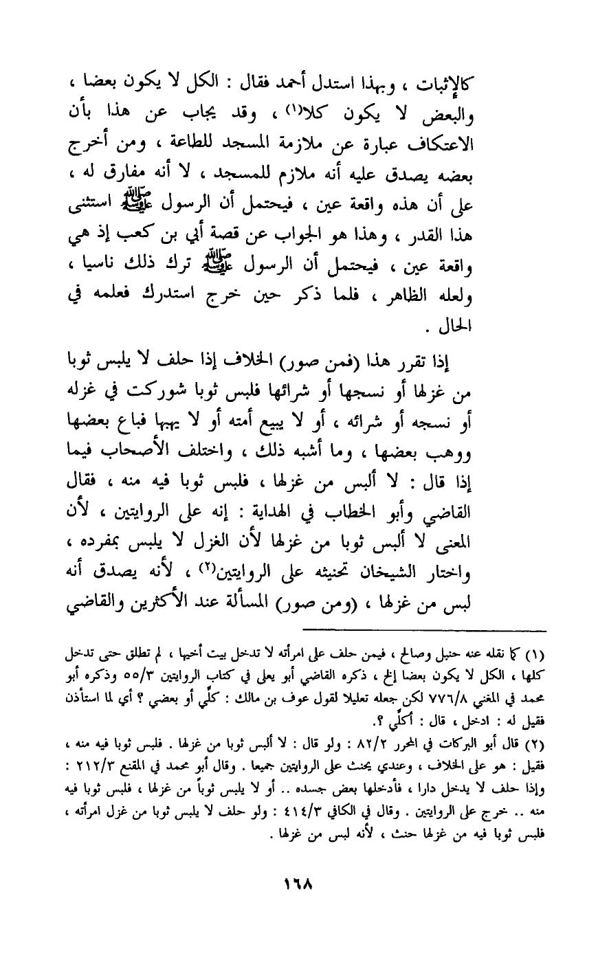 إذا تقرر هذا (فمن صور) الخلاف إذا حلف لا يلبس ثوبا من غزلها أو نسجها أو شرائها فلبس ثوبا شوركت في غزله أو نسجه أو شرائه، أو لا يبيع أمته أو لا يهبها فباع بعضها ووهب بعضها، وما أشبه ذلك، واختلف الأصحاب فيما إذا قال: لا ألبس من غزلها، فلبس ثوبا فيه منه، فقال القاضي وأبو الخطاب في الهداية: إنه على الروايتين، لأن المعنى لا ألبس ثوبا من غزلها لأن الغزل لا يلبس بمفرده، واختار الشيخان تحنيثه على الروايتين، لأنه يصدق أنه لبس من غزلها، (ومن صور) المسألة عند الأكثرين والقاضي