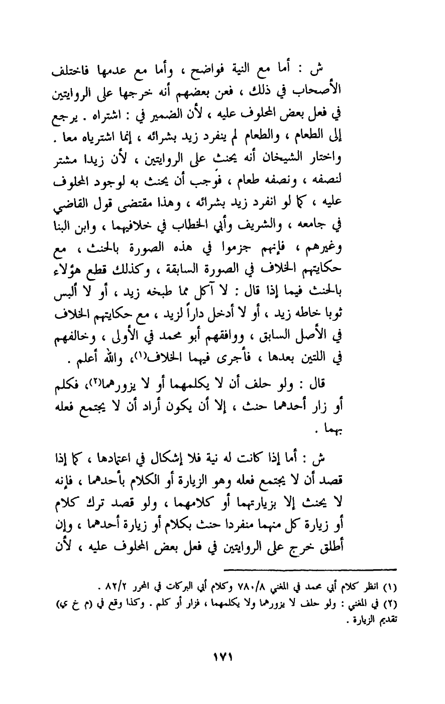 ش: أما إذا كانت له نية فلا إشكال في اعتمادها، كما إذا قصد أن لا يجتمع فعله وهو الزيارة أو الكلام بأحدهما، فإنه لا يحنث إلا بزيارتهما أو كلامهما، ولو قصد ترك كلام أو زيارة كل منهما منفردا حنث بكلام أو زيارة أحدهما، وإن أطلق خرج على الروايتين في فعل بعض المحلوف عليه، لأن