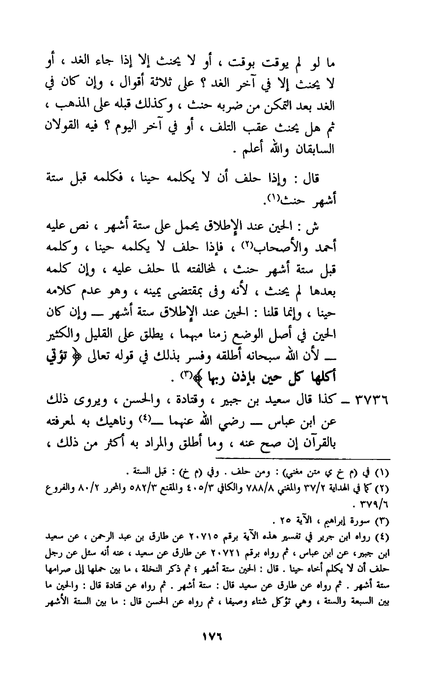 ش: الحين عند الإطلاق يحمل على ستة أشهر، نص عليه أحمد والأصحاب، فإذا حلف لا يكلمه حينا، وكلمه قبل ستة أشهر حنث، لمخالفته لما حلف عليه، وإن كلمه بعدها لم يحنث، لأنه وفى بمقتضى يمينه، وهو عدم كلامه حينا، وإنما قلنا: الحين عند الإطلاق ستة أشهر - وإن كان الحين في أصل الوضع زمنا مبهما، يطلق على القليل والكثير - لأن الله سبحانه أطلقه وفسر بذلك في قَوْله تَعَالَى: {تُؤْتِي أُكُلَهَا كُلَّ حِينٍ بِإِذْنِ رَبِّهَا} [إبراهيم: 25] .
