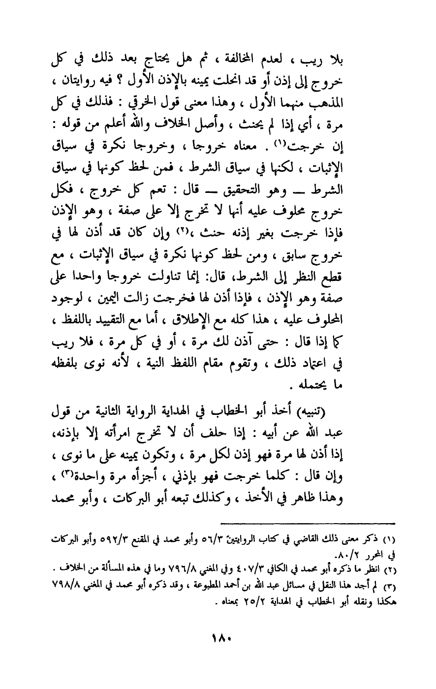 (تنبيه) : أخذ أبو الخطاب في الهداية الرواية الثانية من قول عبد الله عن أبيه: إذا حلف أن لا تخرج امرأته إلا بإذنه، إذا أذن لها مرة فهو إذن لكل مرة، وتكون يمينه على ما نوى، وإن قال: كلما خرجت فهو بإذني، أجزأه مرة واحدة، وهذا ظاهر في الأخذ، وكذلك تبعه أبو البركات، وأبو محمد