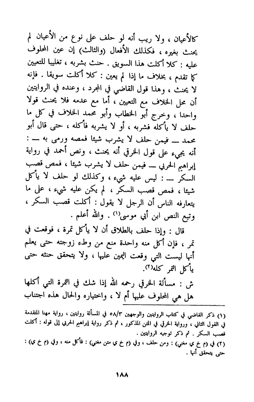 كالأعيان، ولا ريب أنه لو حلف على نوع من الأعيان لم يحنث بغيره، فكذلك الأفعال. (والثالث) : إن عين المحلوف عليه: كلا أكلت هذا السويق. حنث بشربه تغليبا للتعيين كما تقدم، بخلاف ما إذا لم يعين: كلا أكلت سويقا. فإنه لا يحنث، وهذا قول القاضي في المجرد، وعنده في الروايتين أن محل الخلاف مع التعيين، أما مع عدمه فلا يحنث قولا واحدا، وخرج أبو الخطاب وأبو محمد الخلاف في كل ما حلف لا يأكله فشربه، أو لا يشربه فأكله، حتى قال أبو محمد - فيمن حلف لا يشرب شيئا فمصه ورمى به -: أنه يجيء على قول الخرقي أنه يحنث، ونص أحمد في رواية إبراهيم الحربي - فيمن حلف لا يشرب شيئا، فمص قصب السكر -: ليس عليه شيء، وكذلك لو حلف لا يأكل شيئا، فمص قصب السكر، لم يكن عليه شيء، على ما يتعارفه الناس أن الرجل لا يقول: أكلت قصب السكر، وتبع النص ابن أبي موسى. والله أعلم.