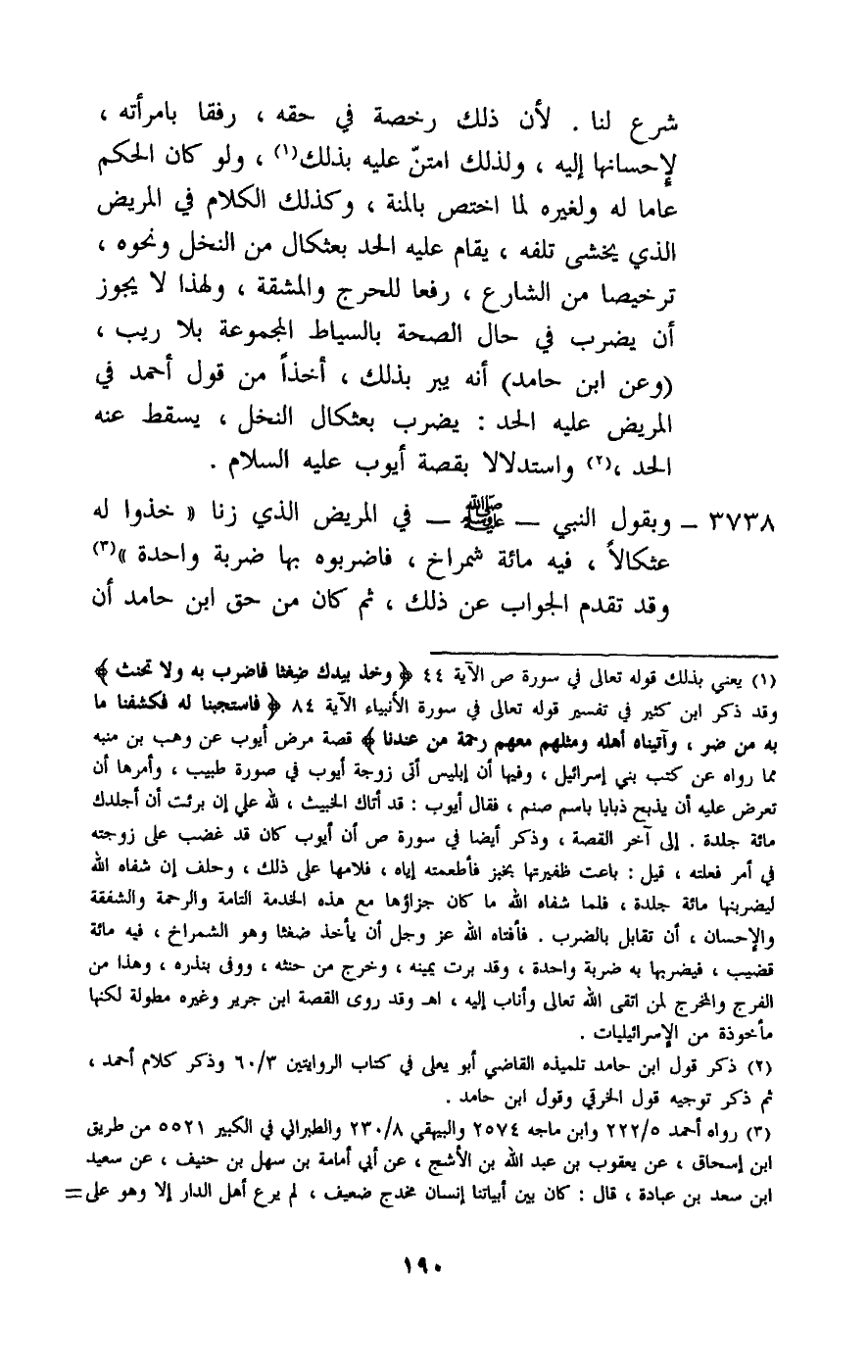 3738 - وبقول النبي - صَلَّى اللَّهُ عَلَيْهِ وَسَلَّمَ - في المريض الذي زنا: «خذوا له عثكالا، فيه مائة شمراخ، فاضربوه بها ضربة واحدة» ، وقد تقدم الجواب عن ذلك، ثم كان من حق ابن حامد أن